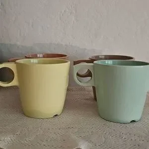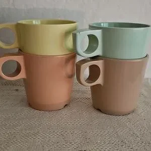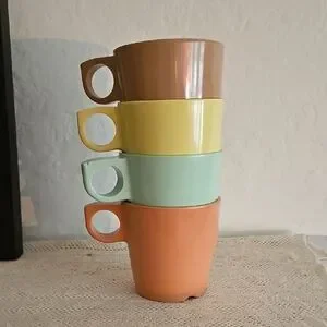 Maplex, and GPL melamine muted color stackable cups. Set of 4, mint green, soft yellow, dusty pink, and a darker beige.