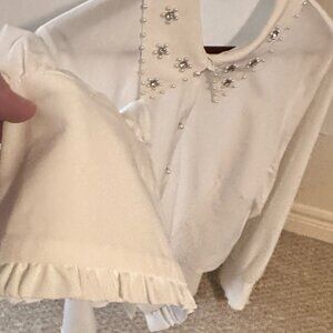 Melanie Lyne Pearl Embellished Button-Up Shirt. Features ruffled sleeves and beaded collar in a white colour. Tag was removed when worn but attached are from Melanie Lyne website showcasing the blouse. It is in a size 10 which is about a Large.