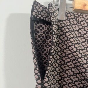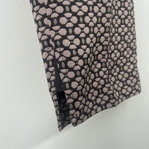 Great condition. Only thing missing is the size fabric tag. The fabric is textured on the thick side, probably a mix of elastane and polyester. Pants have a little slit at the ankle and a side zipper (6.5 inches) with a flat front. No pockets. Great for comfortable office wear. they are high rise.