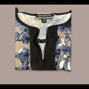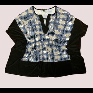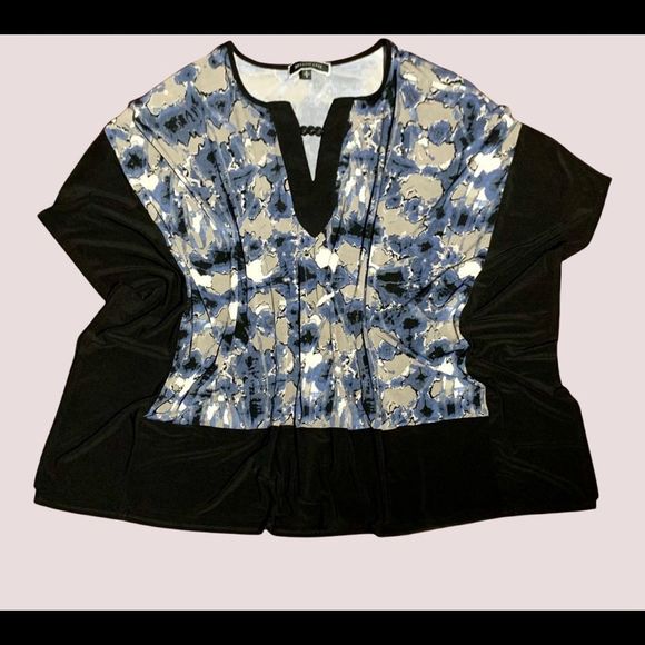 Lovely blue grey and white top with black bat wings a v-neck and a small amount of bling in the middle of the v. Hangs loose and no rips or stains to my knowledge