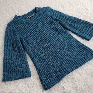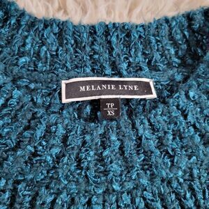 Beautiful rich teal! The knit is a mix of fuzzy yarn and Satin-like ribbon. Super cozy and soft. Material tag removed - composition unknown.