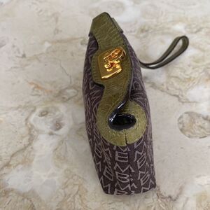 Lovely and in excellent preowned condition Melie Bianco small wallet, has a detachable wrist strap, monogram cloth exterior and vegan leather. Gold tone closure, interior is cloth lined.