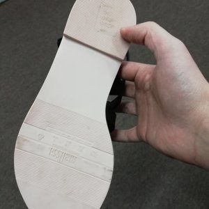 Right shoe has a small scratch on it. See image.