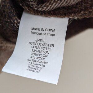 63% Polyester, 14% Acrylic, 13% Rayon, 6% Nylon, 4% Wool, tonal matching buttons, meant to fit oversized! Great for transitional weather. Step bottom hem with slit, allowing for easier motion. Collared, lightweight.