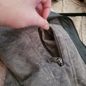 Cozy aviator jacket from Members Only in smooth vegan leather with soft & fluffy faux shearling lining. Trimmed with an angled zip at the front and zippered pockets. Spread collar; dips up slightly at the back.