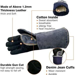 * 【EXTREME HEAT RESISTANT PROTECTION】- Outermost layer:Genuine Cowhide Split Leather . ntermediate layer:a composite product by laminating a kind of high temperature resistant Air-isolated Aluminum Foil and a flame retardant cotton cloth . Inner layer:a 100% soft insulated cotton lining.flame retardant thread stitching.for advanced heat and cold resistance,sweat absorbent,breathable,allergy free.They are guaranteed to withstand extreme temperatures up to 932°F(500℃).