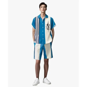 ❤️Men Blue Print Short Sleeve Hawaiian Fit Casual Button Down Beach Shirts