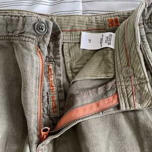GREAT SHORTS PREOWNED BUT 10/10 CONDITION SOFT 100% LINEM FABRIC LIGHT OLIVE GREEN + ORANGE ZIPPER
