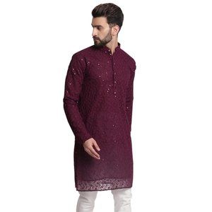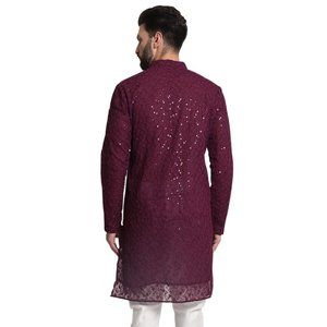 Men Chikankari Georgette Wine Color Kurta Full Sleeve Knee Length Kurta