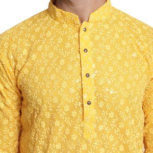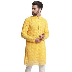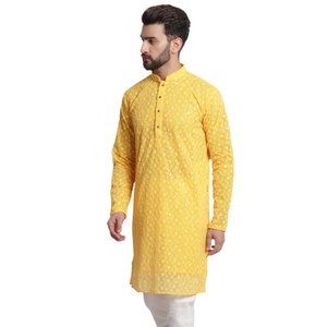 Men Chikankari Georgette Yellow Color Kurta Full Sleeve Knee Length Kurta