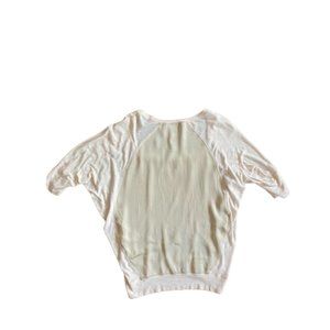 Silk front and back panels, model knit sleeves, and sides. Taupe and Oatmeal. The drape on this top is lovely. I only wore it once or twice, it's in excellent condition. Stretch ribbed sleeves and bottom. The colour of the top is accurate in the second photo.