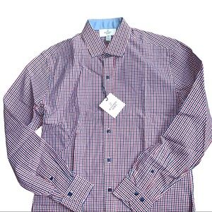 Men's 15.5 Buttoned Down Slim Fit Blue Red Tattersall Check Casual Dress Shirt
