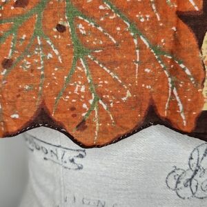 Brown orange yellow & green pocket square handkerchief with 4 detailed Autumn leaves print and scallop trim.