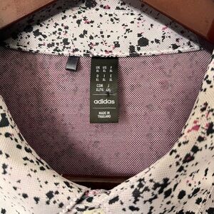 Mens Adidas Jacquard golf polo shirt size XL in brand new like condition. Beautiful spring/summer fun colours with an all over paint splatter print with purple pink and black. No company logos on the polo. Makes a great gift for the golf lover in your life! Beautiful and eye catching on the course. Measures 23” pit to pit with stretch to 23.5” and 30” top to bottom.