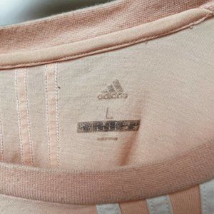 Mens Adidas x Kith T-Shirt in size large. Pink w/ white stripes. Small hole on the back. Pictured.