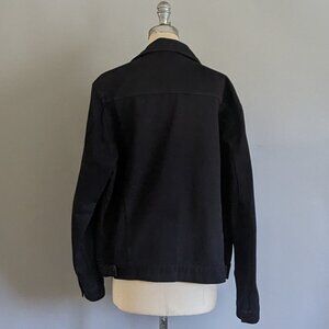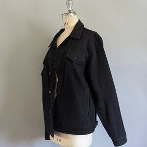 100% cotton, flat black unbranded buttons, side pockets, adjustable waist buttons at back, button close pockets on chest