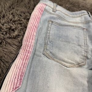Size 34. Light blue, distressed men's jeans. Zipper detailing pocket on right side thigh. Vertical strip pattern on both hips, with faded coloring, light red and white. Button and zip fly.