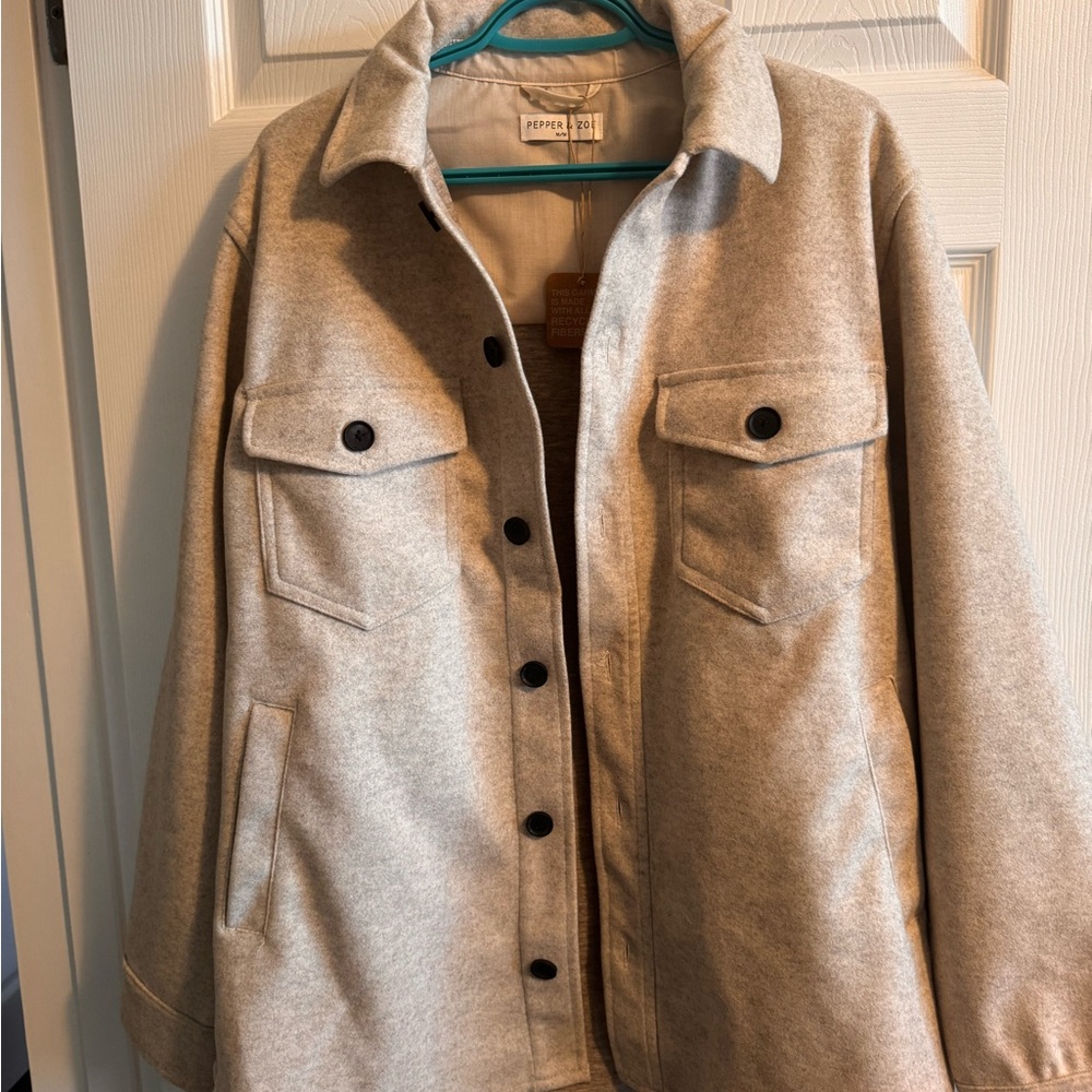 Stylish beige jacket with button-up front. Features two chest pockets. Perfect for layering.
