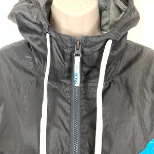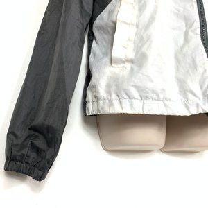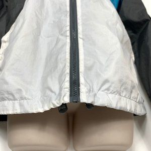 Design Details: Adjustable hood with drawstrings, full zip front closure, color-block pattern, and mesh lining for added breathability
