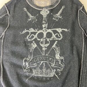Classic Guess sweater with graphic print and exposed seams. Intentionally distressed black