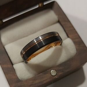 Elegant men's ring featuring a sleek black and silver design with gold accents. Perfect for any occasion.