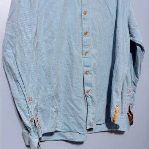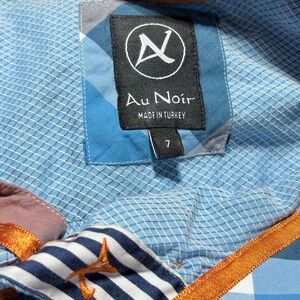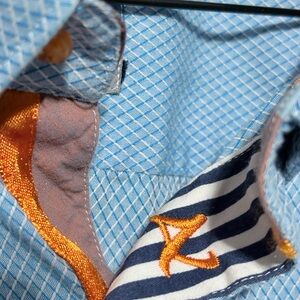 Stylish men's blue button-up jacket with orange accents. Perfect for casual outings.