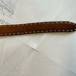 Stylish brown leather belt. Features a silver buckle. Durable and versatile. Light signs of wear close to the holes, please see pics. Lenght is 43 inches.