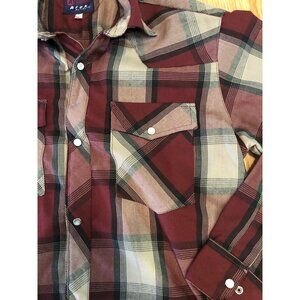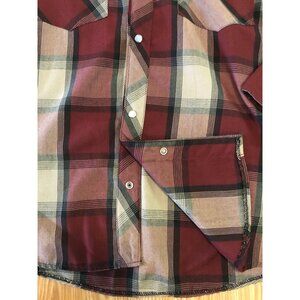 Mens Burgundy & Gray Plaid Long Sleeve Western Pearl Snap Shirt Size 38 ALEX