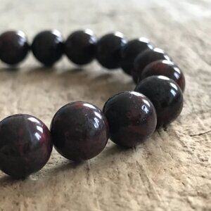 A rich burgundy tone stone permeates this simple men's stretch bracelet. The addition of an antique brass accent bead creates an exotic bohemian look.