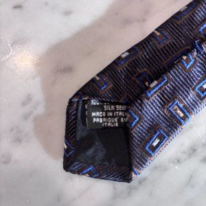 Gorgeous Canali tie with vertical and horizontal raised geometric rectangles of brown, blue and cream on a mixed brown/blue background. The perfect accompaniment to your man about town business suit.