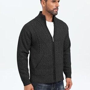 Men's Cardigan Knitted Full Zipper Cardigan Sweaters Fleece Lined Sweater Warm Stand Collar Tops with Pockets