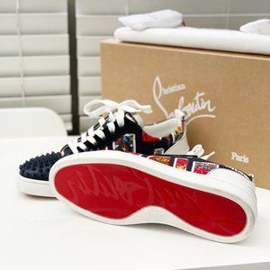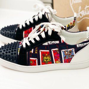 Men's Christian Louboutin Sneakers. This model combines Black calfskin leather with stunning Toile Tarot, inspired by the Taro de Marseille. Signature Matt Marine spikes adorn the toe. Size 44, in excellent condition they have been worn only once. Comes with original contents and box: Dust bags, extra pair of laces (black) and studs.