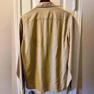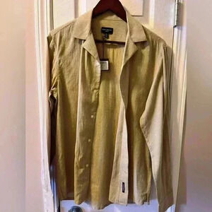 Brand new with tags mens Club Monaco Seersucker camp collar slim fit button down shirt size small slim fit. Measures 20” pit to pit and 29” top to bottom. Made of 100% cotton and colour is tan. Beautiful lightweight casual shirt.