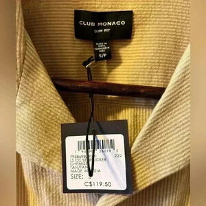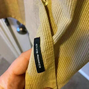 Brand new with tags mens Club Monaco Seersucker camp collar slim fit button down shirt size small slim fit. Measures 20” pit to pit and 29” top to bottom. Made of 100% cotton and colour is tan. Beautiful lightweight casual shirt.