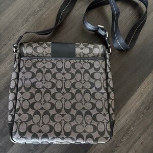 Grey and black satchel by Coach. Like-new condition. Signature Coach monogram print. Foldover flap. Adjustable strap. No longer have authentication but purchased directly from brand.