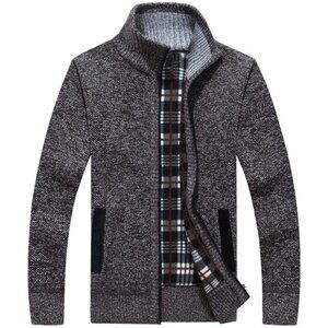 Men's Coffee Casual Slim Full Zip Knitted Polyester Cardigan Sweater with Pocked