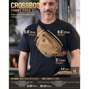 * FLEXIBLE COMPACT STORAGE: Tactical Fanny Pack features multiple pockets, offering partitioned storage for different items. Store quick-access essentials like cash or headphones in the front pocket, secure valuables (phone/passport) in the concealed back pocket, and utilize the small side pockets for coins or tiny items. This design ensures tidy organization with quick access, making daily carry effortless and reliable.