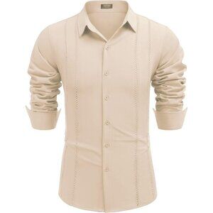 ❤️Mens Cream Cuban Shirt Casual Button Down Shirts Long Sleeve Beach Shirts
