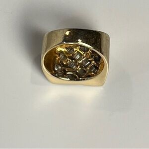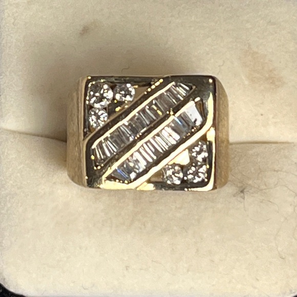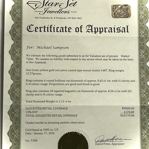 This striking men's diamond ring features a 14KT yellow gold band, a one piece casted type mount, and a unique design with round brilliant cut diamonds of approximately 0.65 ct. tw with I1 clarity and G-H colour range, plus 20 tapered baguette cut diamonds of approximately 0.50 ct tw with SI1 clarity and G-H colour range. This ring has been previously owned and loved, as evidenced in the photos. It weighs 12.57 grams. A certificate of appraisal from Star Set Jewellers, valuing the ring at $10,170.00, is included.