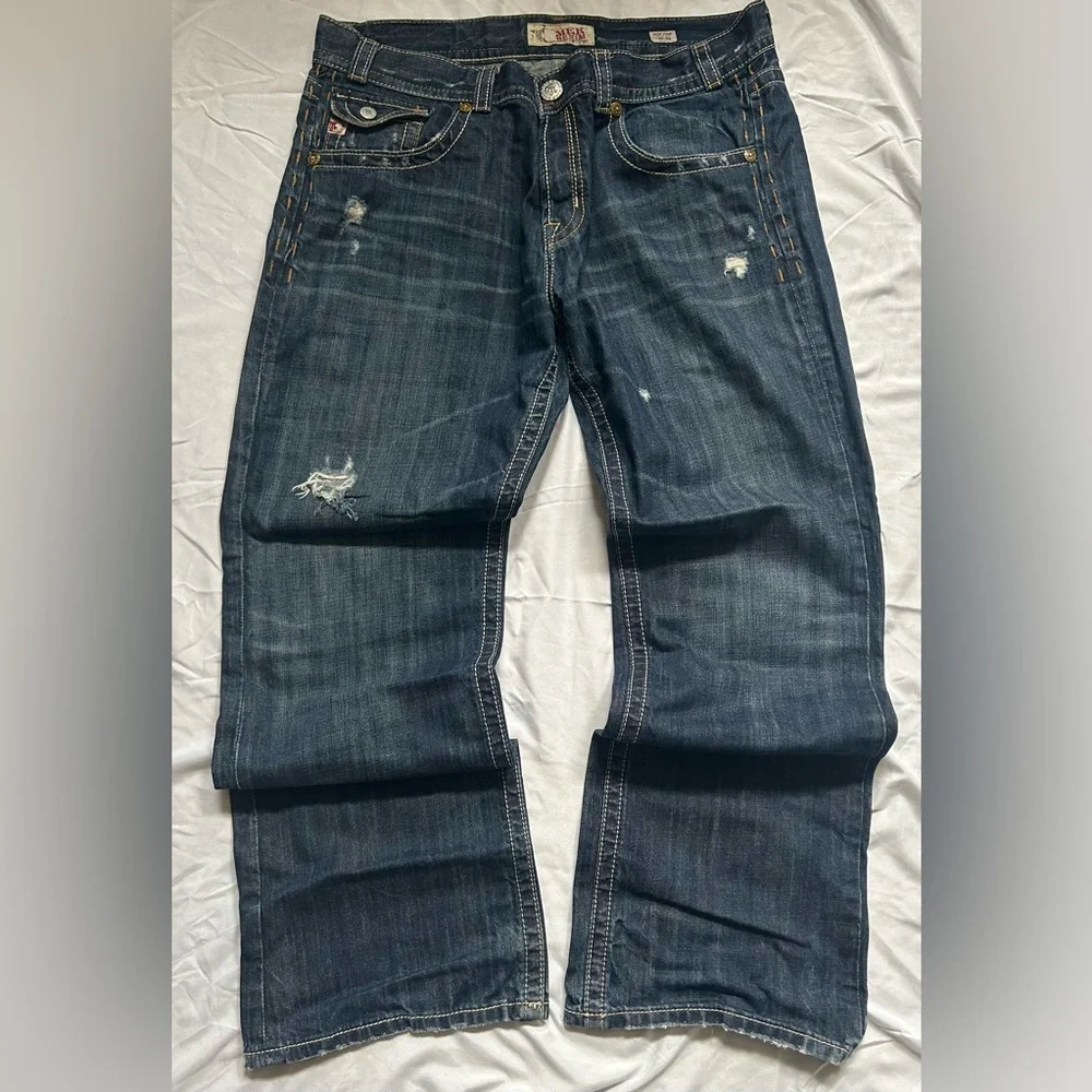 Stylish and comfortable men's distressed blue jeans. Perfect for casual outings. Durable fabric with a modern fit.