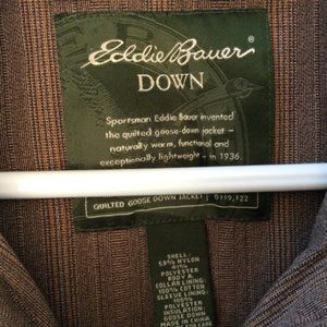 Men's Eddie Bauer Down Jacket size medium. Used in excellent condition. Shell 59% nylon and 41% polyester. Body collar lining 100% cotton. Insulated with goose down. Made in China.