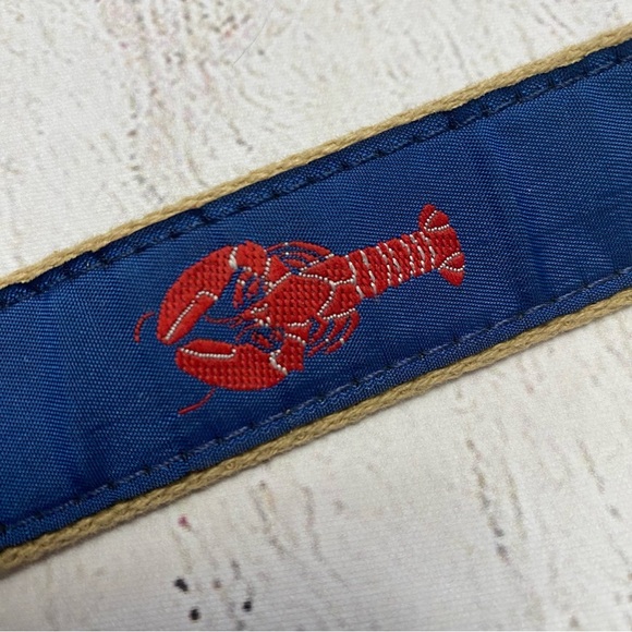 Stylish men's belt featuring a blue strap with red lobster design. Features a solid brass buckle and made with canvas type material. Made by Preston in the USA. Perfect for adding a nautical touch to your outfit.