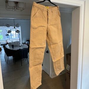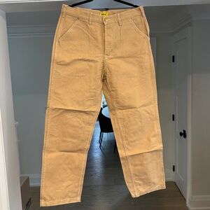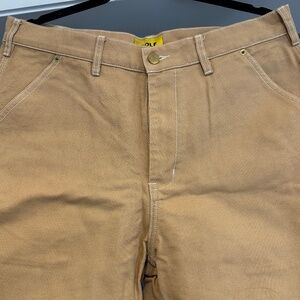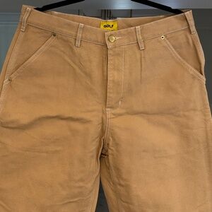 Pristine condition men's GOLF WANG 100% cotton khaki twill work pants with all-over contrast stitching and leather back patch. Zip fly, front slant pockets, brushed gold hardware and open back pockets. From Golf Wang's Summer 2022 Collection, perfect for the transition to Fall!