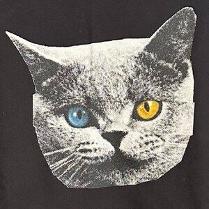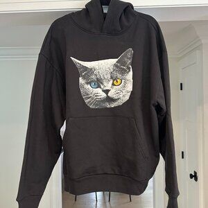 Cotton blend fleece pullover hoodie with kangaroo pocket, ribbed cuffs and hem. Front printed cat graphic with logo printed on hood. 10 YR flag label at left wearer's side seam.