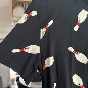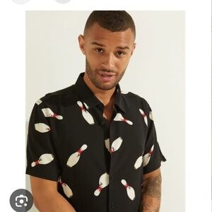 GUESS Slim Fit Short Sleeve Collared Bowling Shirt - Size Men's L. Perfect for the dog days of summer, this black, white, and red slim fit men's collared short sleeve shirt provides serious style in a cool package. Great condition, little worn. Rumples in photos are from storage; shirt will be steamed and fully pressed before shippint.