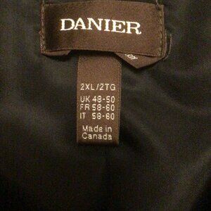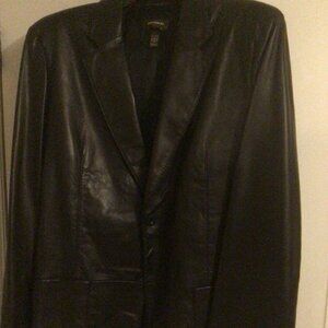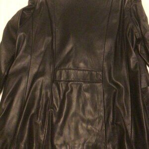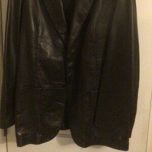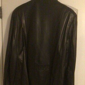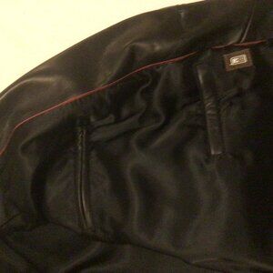 Men's black genuine leather sports jacket, soft buttery smooth lambskin premium leather. Stitching around colour and trim, high quality finish, leather band stitched on back for elevated design. Made in Canada. New unused. Size US XXL