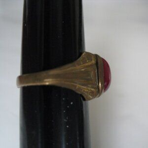 You are looking at a Men's Gold Tone Vintage Ring Size 9+. It has a red stone. Not glass but plastic or resin?? Very good condition. Thanks for looking!