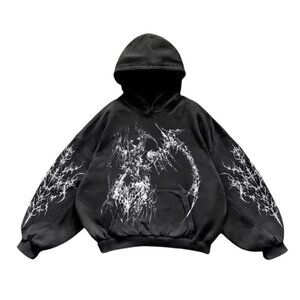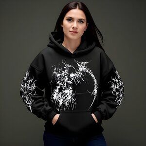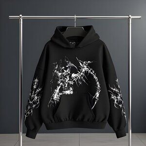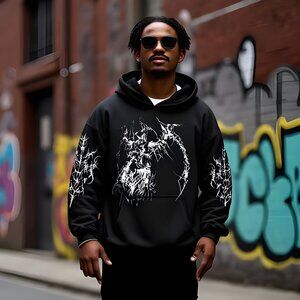 Elevate your streetwear game with this men’s black graphic hoodie, a perfect fusion of gothic aesthetics and modern urban fashion. Designed for those who embrace bold, alternative styles, this hoodie features striking graphic details that add an edge to any outfit. Made from a premium cotton-polyester blend, it delivers the ideal balance of softness, breathability, and durability, ensuring all-day comfort and long-lasting wear. The relaxed fit allows for effortless layering, while the adjustable drawstring hood and ribbed cuffs provide a snug, customizable fit. A spacious kangaroo pocket adds practicality, making it perfect for carrying essentials or keeping hands warm. Whether paired with distressed jeans, cargo pants, or joggers, this hoodie makes a powerful statement, embodying the raw energy of dark streetwear fashion.