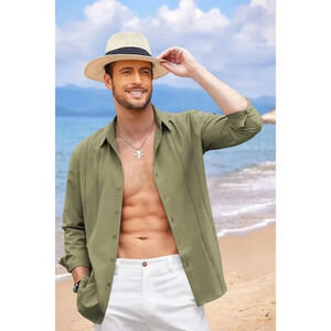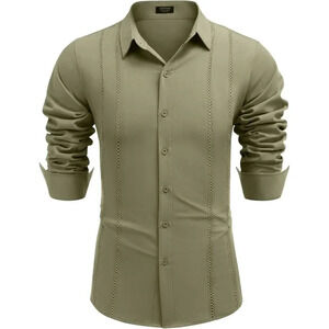 ❤️Mens Green Cuban Shirt Casual Button Down Shirts Long Sleeve Beach Shirts