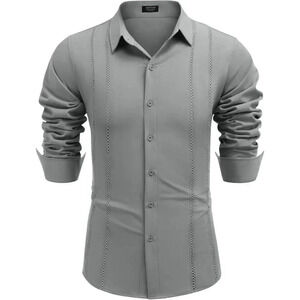 ❤️Mens Grey Cuban Shirt Casual Button Down Shirts Long Sleeve Beach Shirts